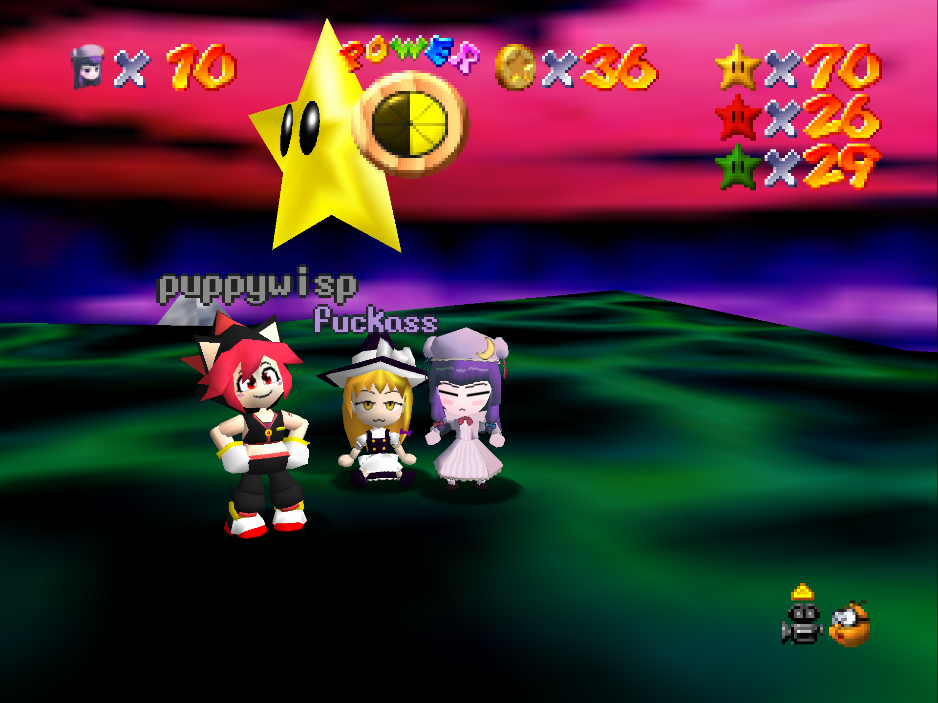 game (romhack)played in sm64 coop. really excellent level design, lots of fun to move through and doesn't overstay it's welcome. has some trickier jumps than i'd expect for an easy hack, but nothing insurmountable. good difficulty level overall. i'm feeling like the controls for sm64 are starting to click for me. definitely excited to play more romhacks.
